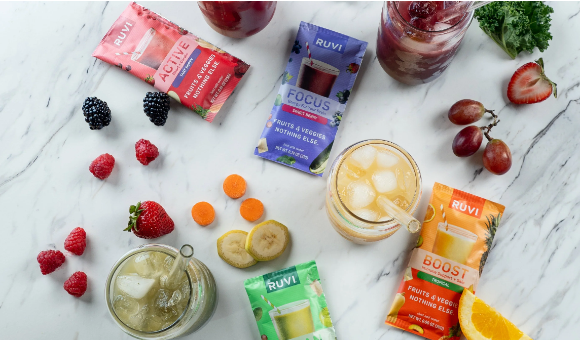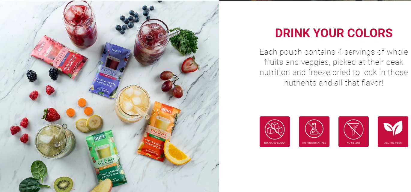 We know it can be hard to eat enough fruits and veggies. They take time to prep, they're messy, and don't always taste good. But without them you lack energy and vitality. Ruvi is an easier, tastier way to get your fruits and veggies. Simply pour the freeze-dried powder into a shaker bottle with water, shake and drink!